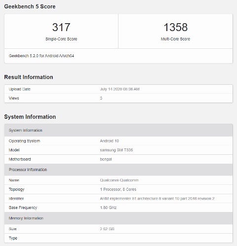 Berdasarkan data yang ada di dalam daftar Geekbench, chipset yang digunakan Galaxy Tab A 7.0 2020 tertulis dengan kode ‘Bengal’ yang memiliki CPU octa-core berkecepatan 1.8 GHz milik Qualcomm dan akan berjalan di sistem operasi Android 10.