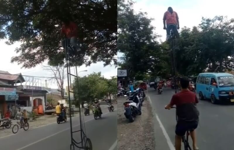 Terlihat dalam video yang dibagikan oleh beberapa akun ke media sosial, pria tersebut sedang gowes di jalanan menggunakan sepeda yang ukurannya sangat tinggi.