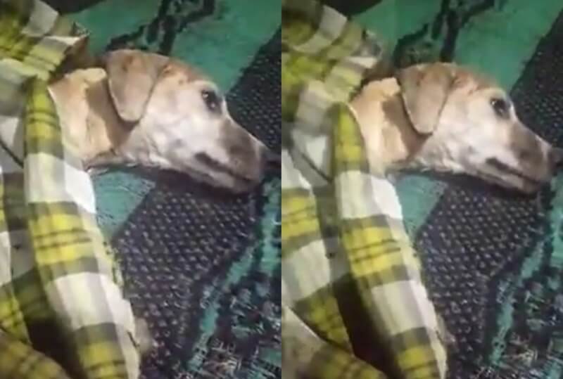 Anjing yang disebut jadi-jadian itu tampak berbaring di atas tikar dan diselimuti kain sarung dengan kondisi yang mengenaskan karena tubuhnya terus mengigil.