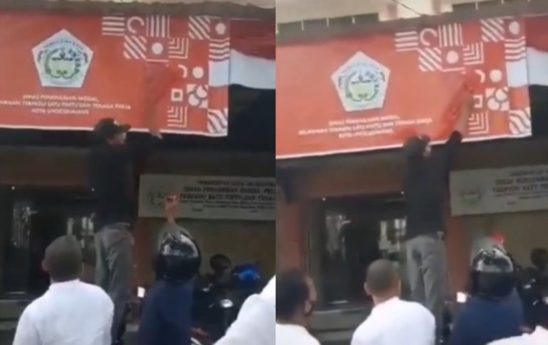 Dalam video yang beredar di media sosial, terlihat seorang warga berdiri di atas motor, ia tengah mengecat spanduk logo HUT RI ke-75 menggunakan cat berwarna merah.