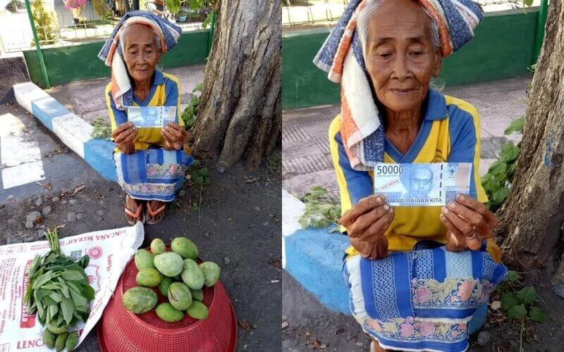 Dalam foto yang dibagikan, terlihat seorang nenek yang bekerja sebagai penjual mangga itu sedang menunjukkan uang Rp 50 ribu yang tertulis jelas itu adalah uang mainan.