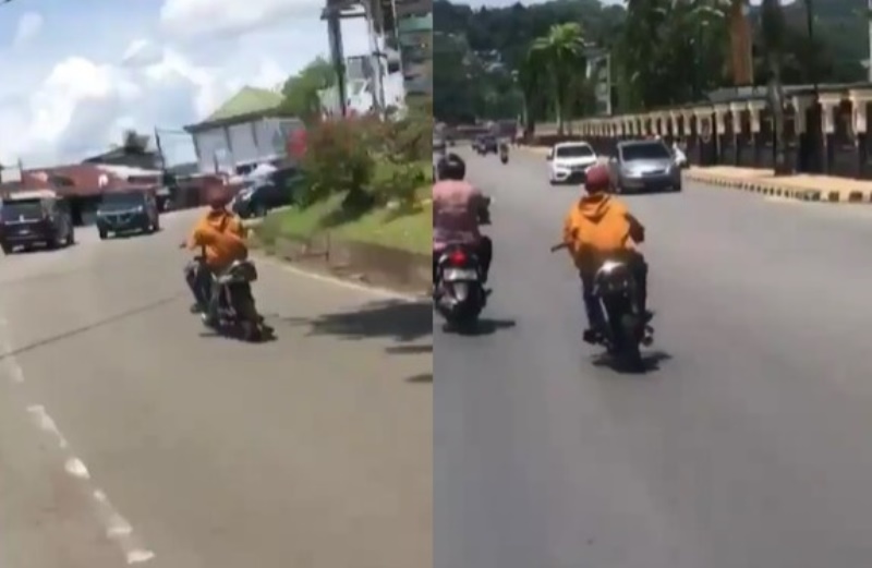 Dari arah belakang, pengendara motor lain tampak merekam hal tersebut. Entah sengaja atau tidak, pemotor tersebut pun mulai ugalan-ugalan di jalan.