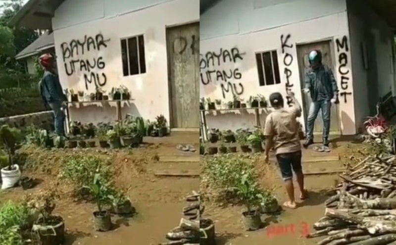 Pada video selanjutnya, pemilik rumah pun datang dan protes karena rumahnya dicoret-coret oleh si debt collector.