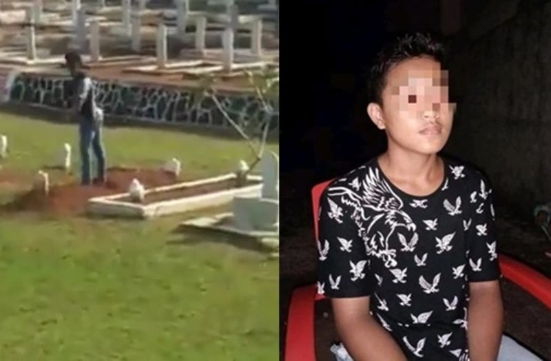 Ia bahkan melakukan gerakan push up serta mencoba mencabut nisan salah satu makam. Dari kejauhan, teman-temannya terus berteriak sembari tertawa terbahak-bahak melihat aksi si remaja.