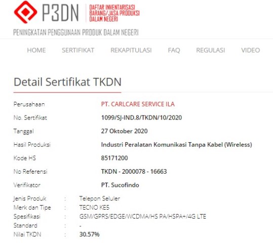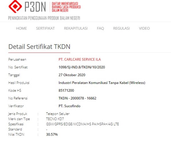 Pantauan Rancah Post dari situs TKDN Kemenperin, ada dua perangkat yang didaftarkan oleh PT. Calcare Service Ila, yaitu perangkat telepon seluler dengan kode model TECNO KE5 dan TECNO KD7.