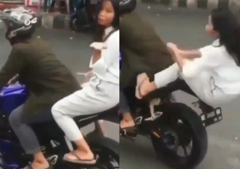 Sepertinya ia belum siap dan tidak berpegangan pada si pria sehingga saat motor melaju ia pun terpental ke belakang.