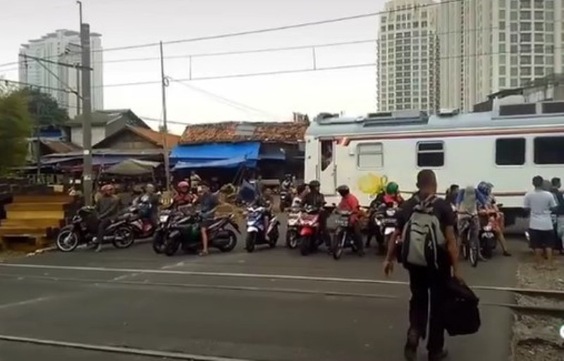 Hal tersebut pula yang dilakukan oleh sejumlah pengendara motor yang terekam kamera sedang berhenti saat ada tanda kereta hendak lewat.