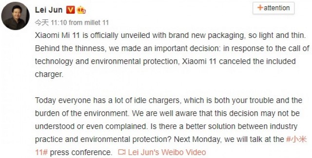 Petinggi Xiaomi tersebut menyampaikan bahwa mereka sengaja menghilangkan charger pada kotak penjualan Mi 11 dengan alasan untuk mengurangi dampak pencemaran lingkungan.