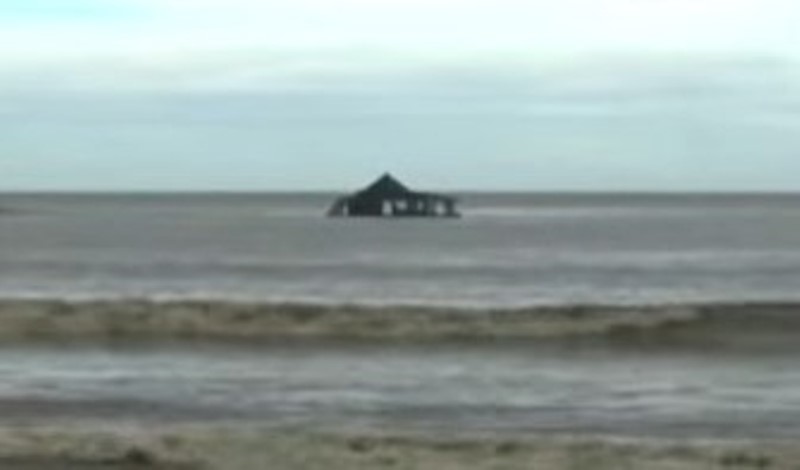 Dalam video yang beredar di media sosial, terlihat bangunan masjid itu terombang-ambing di tengah lautan.