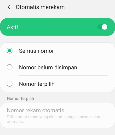 Setelah diaktifkan, layar hp Samsung M20 kamu akan menampilkan tiga opsi menu, yakni merekam semua panggilan secara otomatis, merekam panggilan dari nomor yang belum disimpan, atau merekam panggilan dari nomor terpilih semisal atasan, pacar atau gebetan.