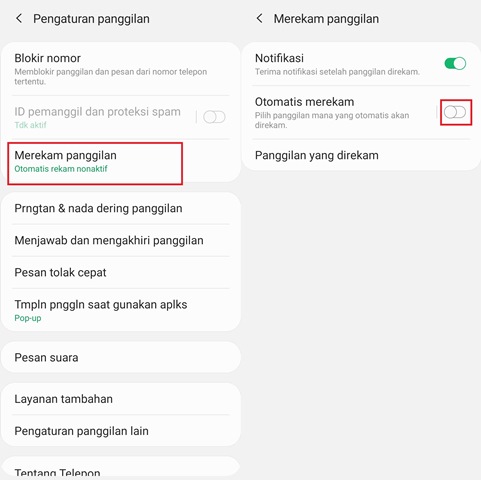 Pilih menu Merekam Panggilan dan klik tombol geser yang berada di samping menu Otomatis Merekam hingga berwarna hijau.