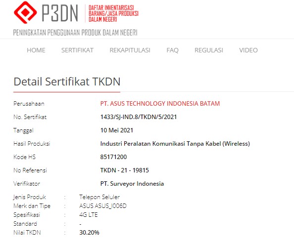 Pantauan Rancah Post, ponsel yang memiliki nomor model ASUS_I006D ini terdaftar di situs TKDN dengan nomor sertifikat 1433/SJ-IND.8/TKDN/5/2021 dan dipublikasikan sejak tanggal 10 Mei 2021. ASUS_I006D telah memenuhi standar TKDN dengan nilai kandungan 30.20%.