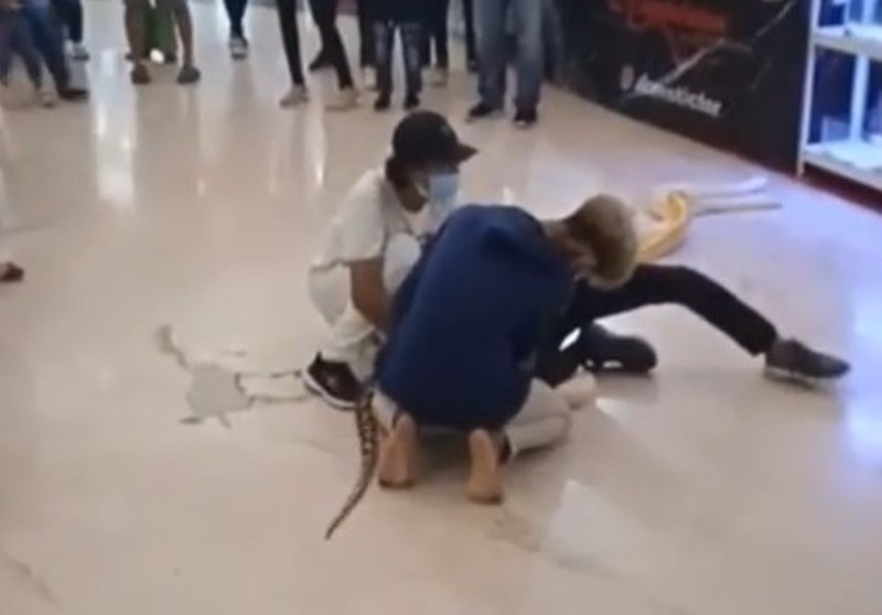 Dua orang pria tampak mencoba menolong korban agar terbebas dari gigitan ular. Sontak saja, kejadian nahas itu pun membuat geger dan menjadi tontonan para pengunjung yang saat itu ada di mal.