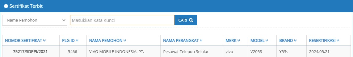 Tanda-tanda kelahiran Vivo Y53s 5G di Indonesia terlihat dari laman Tingkat Kandungan Dalam Negeri (TKDN) yang menerbitkan sertifikat bernomor 820/SJ-IND.8/TKDN/4/2021 untuk perangkat seluler dengan nomor model V2058.