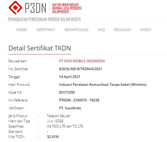 Sertifikat tersebut diterbitkan pada tanggal 14 April 2021. Vivo V2058 dinyatakan telah lolos TKDN dengan nilai kandungan sebesar 32.41%.