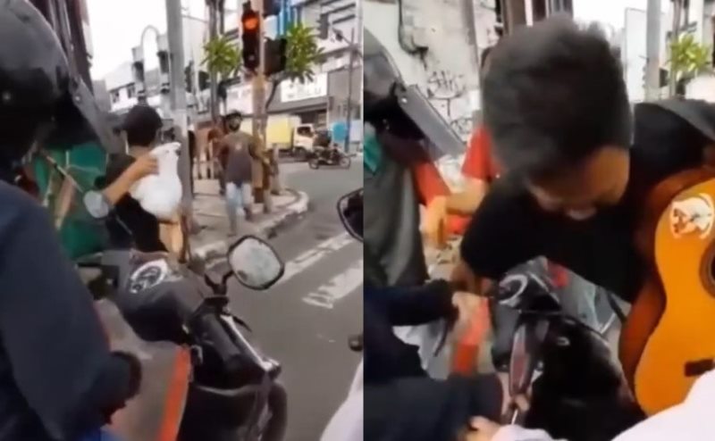 Pemotor yang tampak panik hanya bisa pasrah dan membiarkan para pengamen mengambil makanan di motornya. Setelah mengambil semua makanan, para pengamen langsung pergi meninggalkan lokasi.