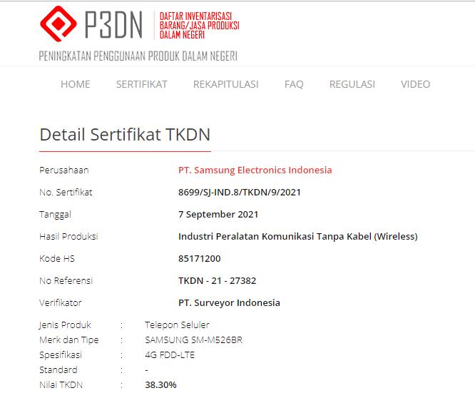 Dalam sertifikat tersebut tersirat bahwa perangkat dengan nomor model Samsung SM-M526BR itu telah memenuhi standar TKDN dengan nilai kandungan di atas 30% atau lebih tepatnya adalah 38.30%.