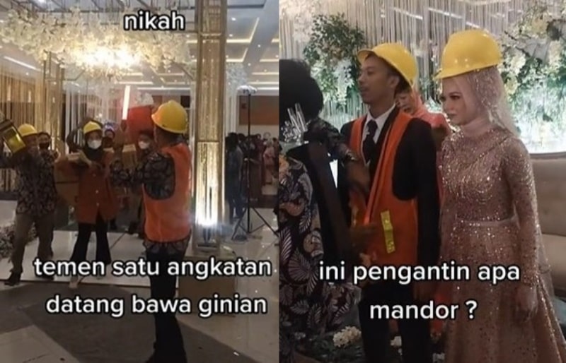 Dalam video tersebut terlihat rombongan tamu undangan tengah berjalan menuju pelaminan. Mereka tampak kompak memakai helm proyek, bahkan yang berjalan paling depan sampai memakai rompi pengaman berwarna oren.