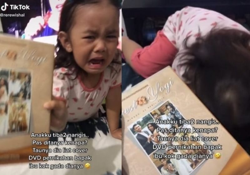 “Anakku tiba-tiba nangis. Pas ditanya kenapa? Taunya dia liat cover DVD pernikahan bapak ibu kok gak ada dianya. Wkwkwk sedihnya lama gara-gara gak diundang kawinan ibu bapaknya,” tulis dalam narasi video.