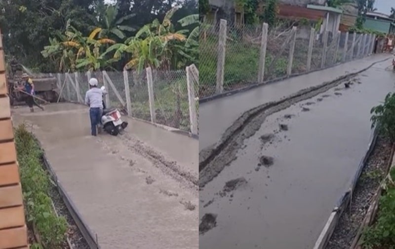 Dalam video yang dibagikan akun TikTok @phuochoanghome, terlihat seorang pria tengah mendorong sepeda motornya di jalanan yang baru cor.