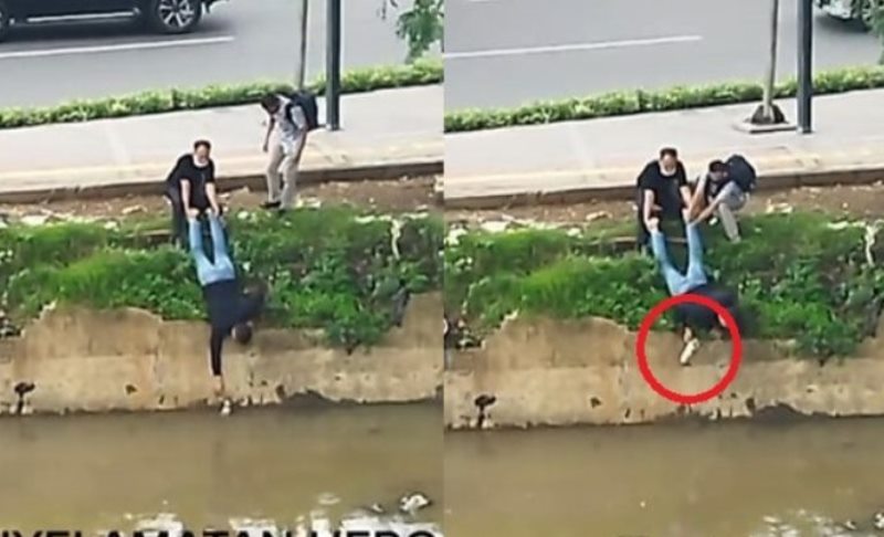 Seorang pria lainnya lagi yang melintas di lokasi pun ikut membantu memegangi kakinya. Akhirnya, perjuangan mereka pun berhasil, kucing itu pun dapat diselamatkan dari dalam sungai.