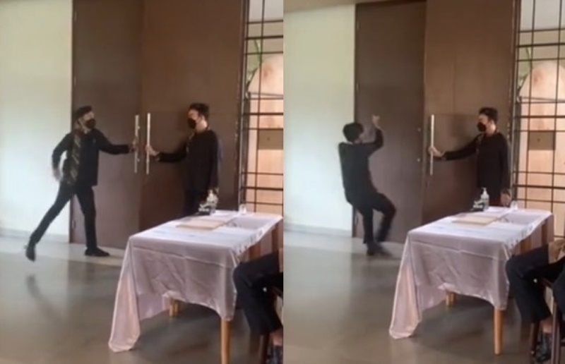 Meski sambil menahan malu, crew WO yang terjatuh langsung bangkit dan berjalan menuju pintu untuk membukanya kembali.