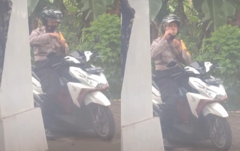 Dalam video tersebut terlihat seorang pria berseragam polisi tengah duduk santai di atas motor tepat di depan rumah warga.