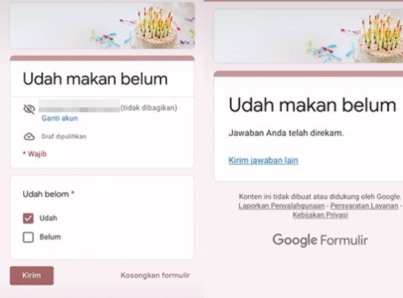 Tampak formulir online yang dibuat ibunya itu berisi pertanyaan “Udah makan belum”, lalu anak-anaknya bisa mengisi survei, yakni “Udah” dan “Belum”.