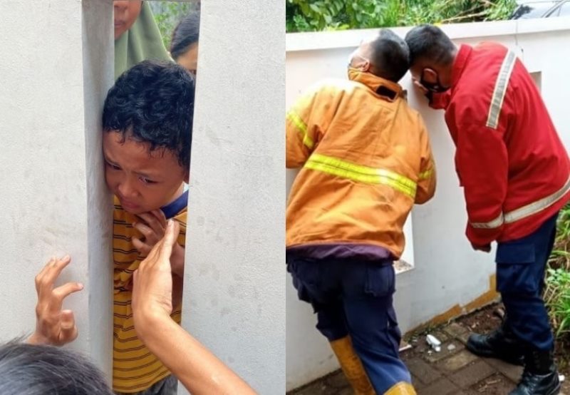 Sosial Media, RANCAH POST – Kejadian nahas dialami oleh seorang bocah laki-laki yang kepalanya terjepit di sela-sela tembok. Pemadam kebakaran (damkar) pun turun tangan untuk menyelamatkan bocah tersebut.