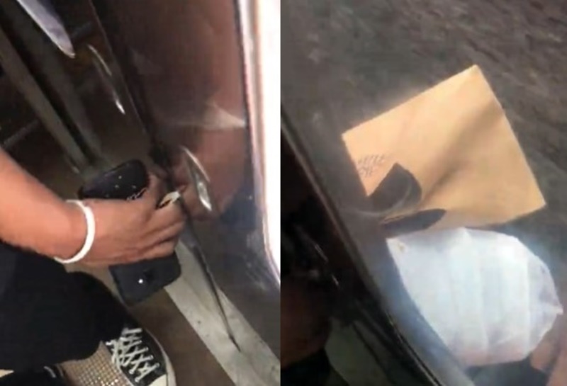 Si perekam pun merekam kondisi tangan si pria dan barang belanjaan si pria yang berada di luar gerbong kereta.