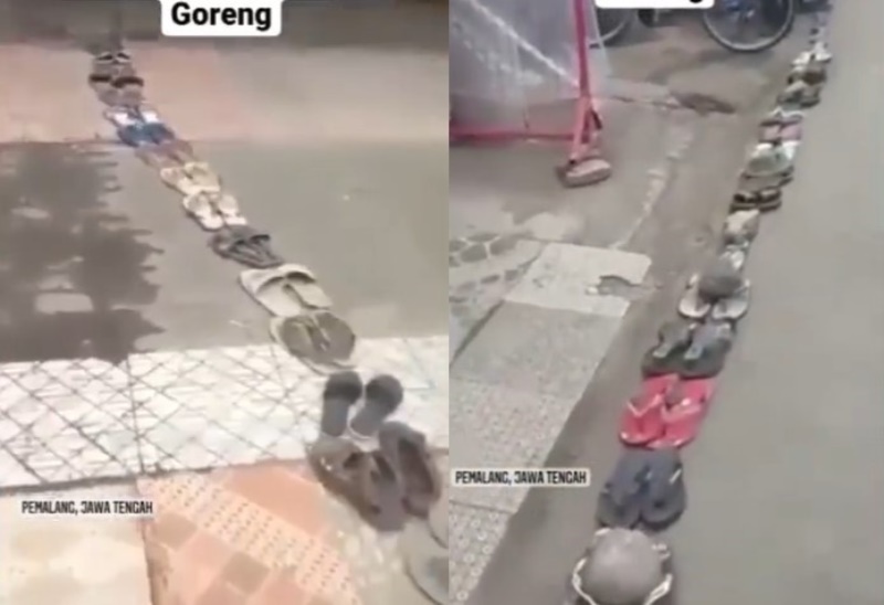 Dalam video tersebut terlihat sandal-sandal milik warga yang berjejer di dekat toko hingga mengular ke jalanan.