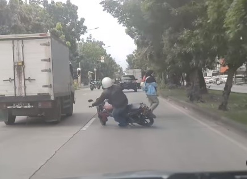 Demi menghindari menabrak si emak-emak, pengendara motor itu pun melakukan aksi di luar dugaan yang berakhir membuat dirinya terjungkal.
