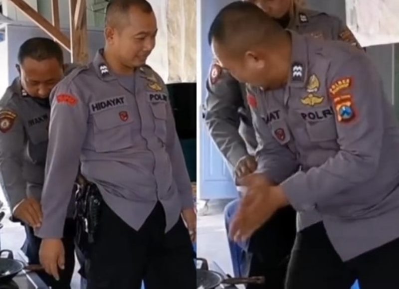 Ya, polisi itu menjahili temannya yang juga polisi dengan tempelkan tangan kanannya ke wajan yang masih panas.