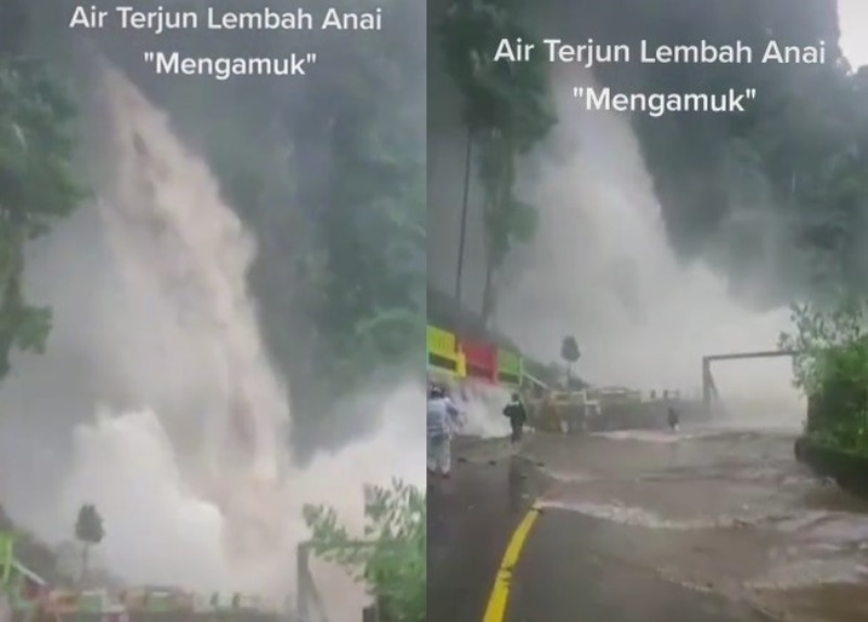 Detik-detik saat air terjun Lembah Anai meluap hingga menutupi jalan sempat direkam oleh seseorang yang berada di lokasi.