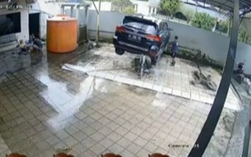 Ketika para pekerja sedang mencuci bagian ban depan serta kap depan mobil, hidrolik itu tampak perlahan-lahan bergerak naik mengangkat mobil.
