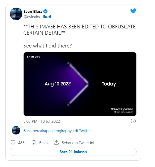 Melalui postingan di akun Twitter miliknya (@evleaks) yang sudah bercentang biru, Evan mengunggah foto undangan Galaxy Unpacked 2022 yang akan digelar pada 10 Agustus mendatang.