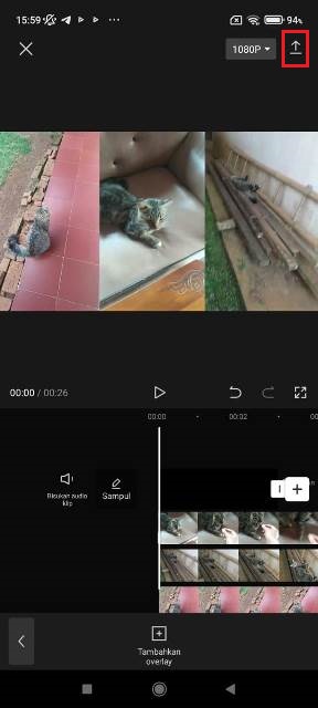 - Jika sudah selesai mengedit kolase video, langsung simpan hasilnya dengan mengklik icon ekspor di pojok kanan atas.