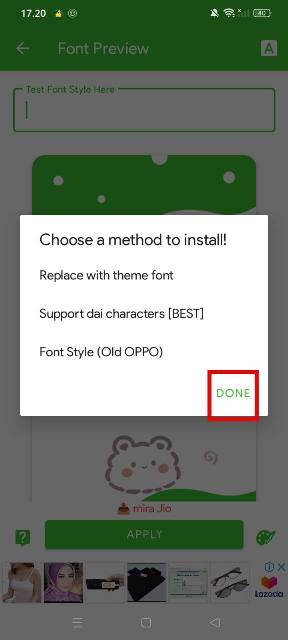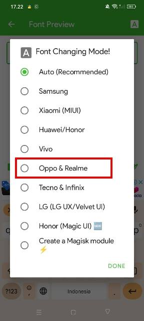 - Lalu pilih Font Changing Mode, pilih untuk HP Oppo & Realme dan klik Done.