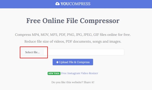 - Setelah laman YouCompress terbuka, klik Selecet file untuk memilih video yang ukurannya akan dikurangi.