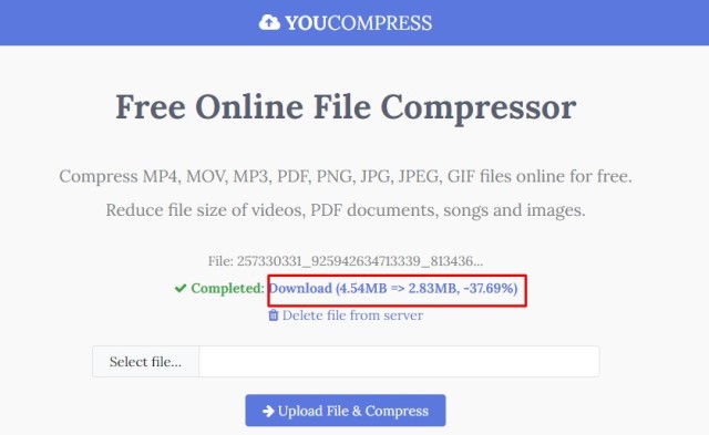 - Tunggu beberapa saat, kemudian klik link Download File untuk menyimpan hasil video yang sudah dikompres.
