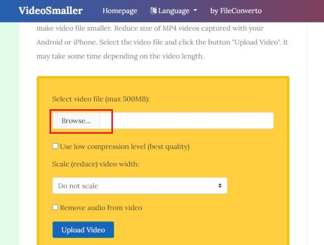- Kemudian, klik Browse untuk memilih video yang akan dikompres.