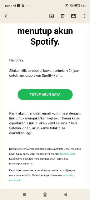 Cara menghapus akun Spotify selanjutnya silakan buka email konfirmasi jika kamu ingin menghapus akun Spotify. Email tersebut akan datang ke akun email yang kamu masukkan saat mendaftar akun Spotify.