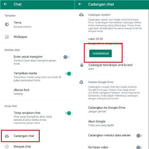- Selanjutnya, klik Cadangan chat > Cadangkan > pilih Google Drive.