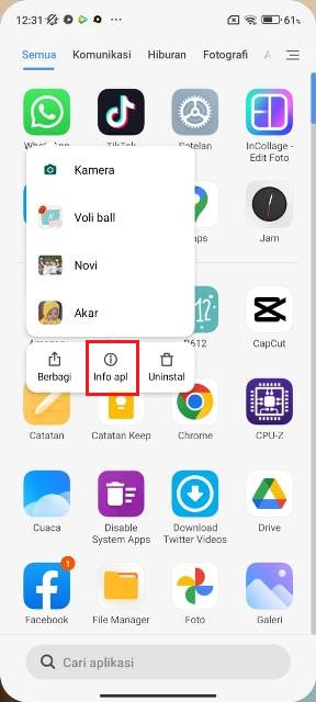 - Selain dengan cara itu, kamu juga bisa klik dan tahan icon aplikasi WhatsApp di layar utama dan klik Info apl.