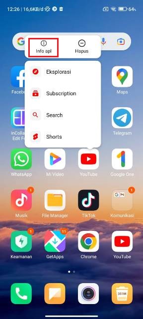 Untuk menghapus cache aplikasi, silakan tekan dan tahan aplikasi yang ingin dihapus cache-nya. Lalu klik Info apl.