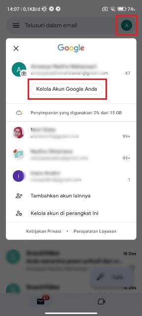 - Klik foto profil akun Gmail di pojok kanan atas > silakan pilih akun Google tempat menyimpan kata sandi TikTok > klik Kelola Akun Google Anda.