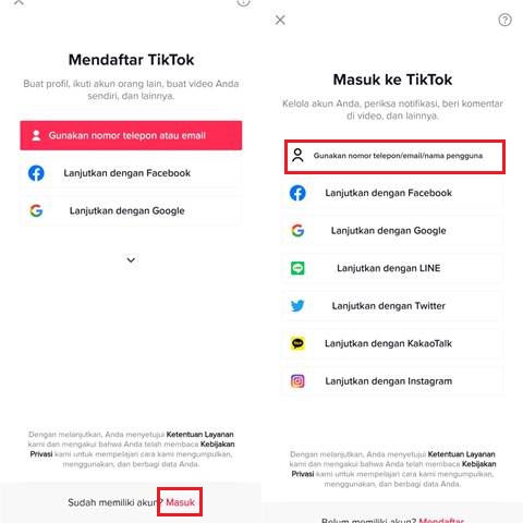 - Klik menu Masuk > klik Gunakan nomor telepon/email/nama pengguna.
