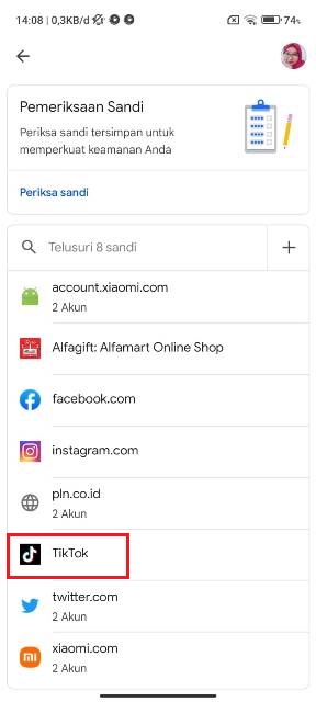 - Pada menu Pengelola Sandi, akan tampil sejumlah akun yang kata sandinya tersimpan di akun Google tersebut, termasuk juga TikTok.
