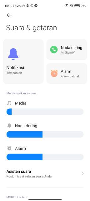 Nah, pada menu ini kalian bisa mengatur berbagai hal yang berkaitan dengan Suara & getaran, mulai mengatur nada notifikasi, nada dering, Alarm, menyesuaikan volume, mengaktifkan mode hening, dan masih banyak yang lainnya.