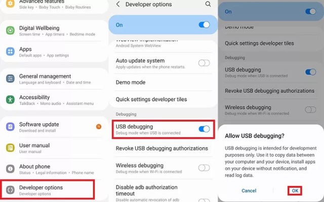 - Setelah itu, masuk ke menu Developer Option dan aktifkan USB Debugging.